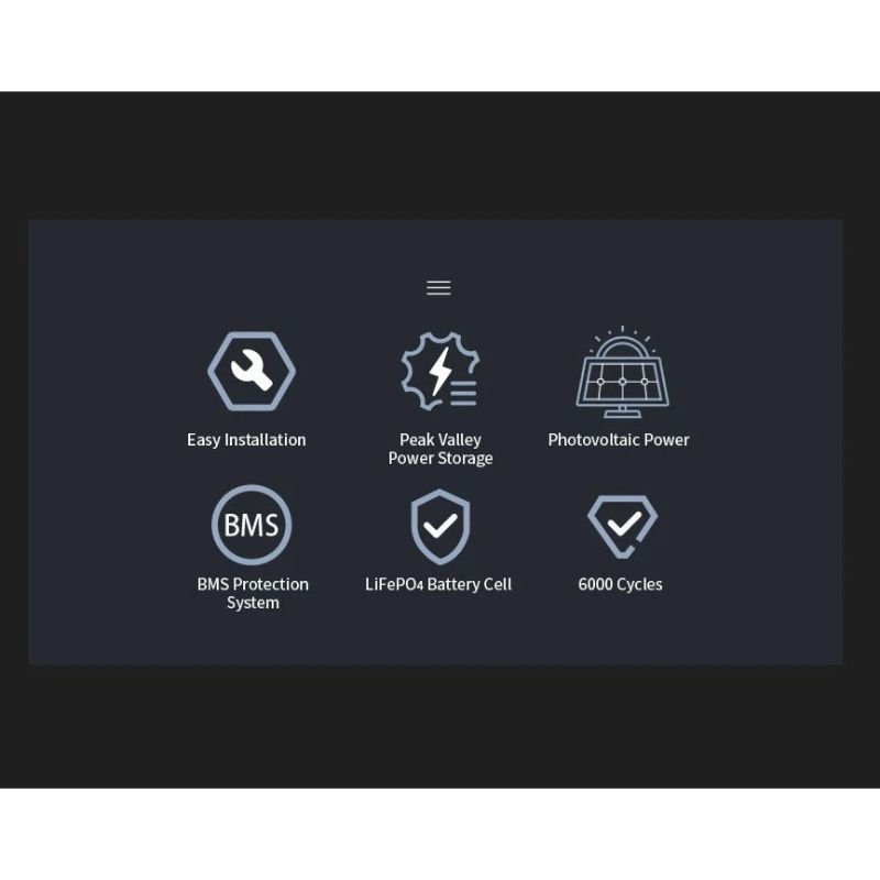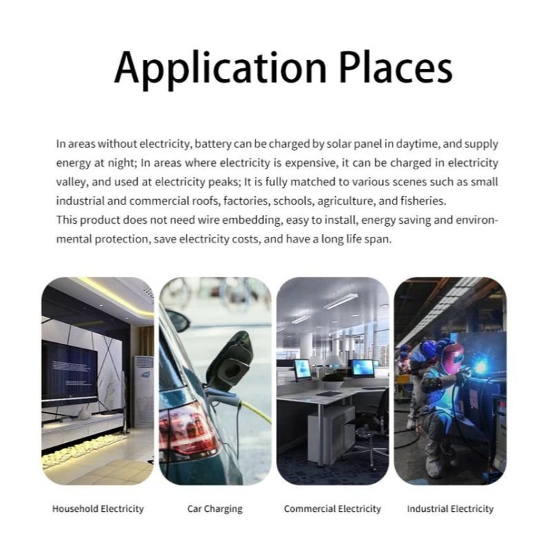 In areas without electricity, battery can be charged by solar panel in daytime, and supply energy at night; In areas where electricity is expensive, it can be charged in electricity valley, and used at electricity peaks; It is fully matched to various scenes such as small industrial and commercial roofs, factories, schools, agriculture, and fisheries. This product does not need wire embedding, easy to install, energy saving and environmental protection, save electricity costs, and have a long life span.