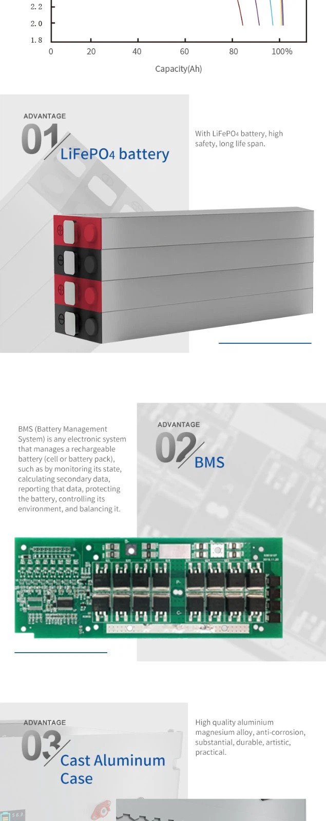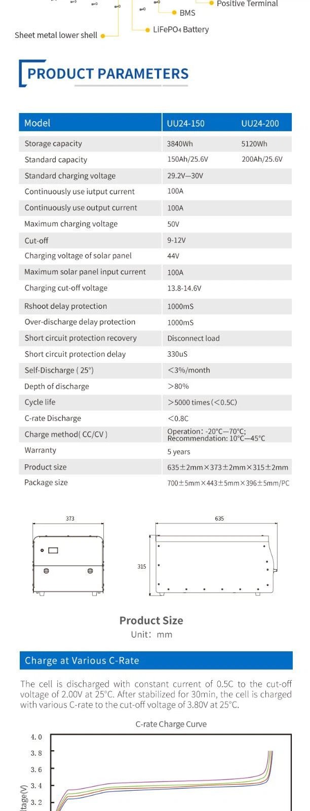 UU24V/200Ah Lithium ion battery packs 1.All in one mould design and production, easy to install. 2.With longer span life LiFePO4 battery, over 12 years lifespan, ensure the whole set products’life span. 3.Dustproof structure design, DC output, safe and reliable. 4.Integrated packaging, safe and convenient to transport.