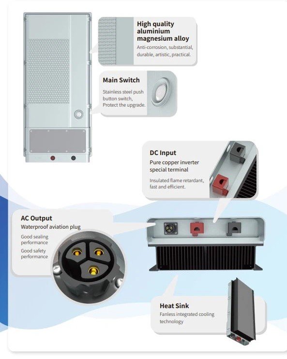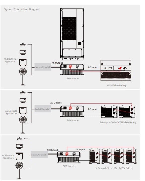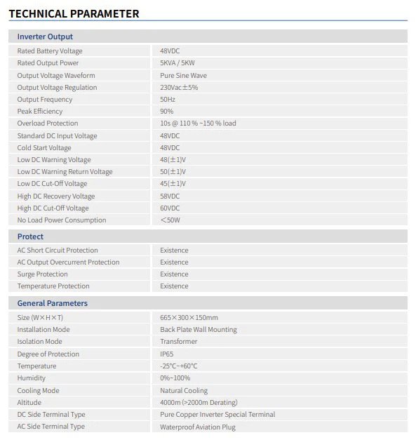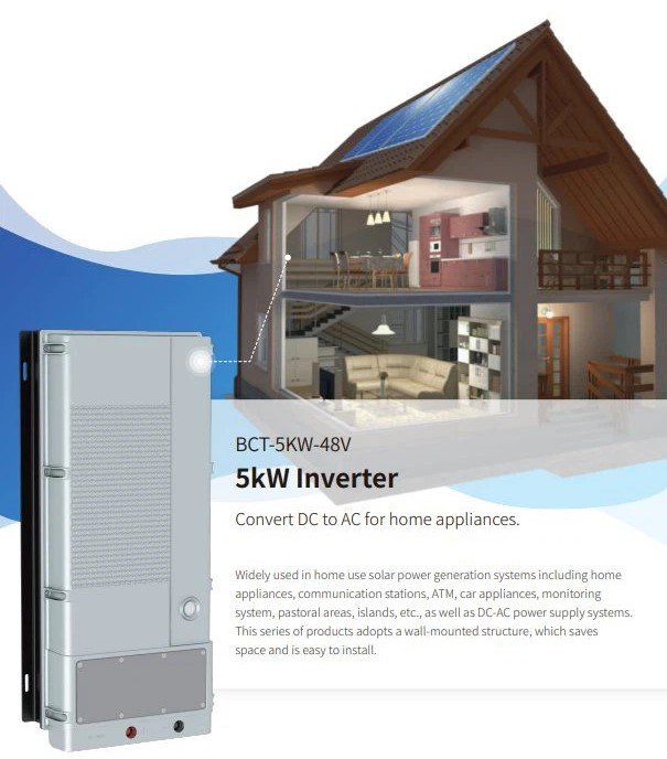 5kW Inverter Convert DC to AC for home appliances Widely used in home use solar power generation systems including home appliances, communication stations, ATM, car appliances, monitoring system, pastoral areas, islands, etc., as well as DC-AC power supply systems. This series of products adopts a wall-mounted structure, which saves space and is easy to install