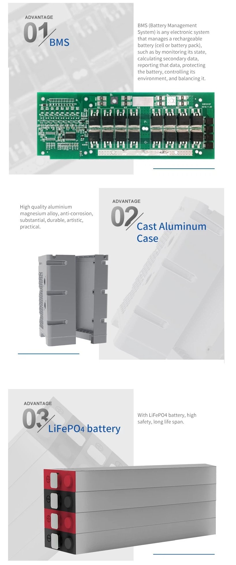 5 Years Warranty Blue Carbon 12V-200Ah Lithium Ion Batteries: (1) Standard Capacity: 200AH (2) Rated Voltage: 12.8V (3) Maximum Input current:100A; (4) Maximum output current: 100A; (5) Charging v oltage: 14.4V-14.6V; (6) Cut off: 2.5V single cell (7) Depth of discharge: up to 95%.