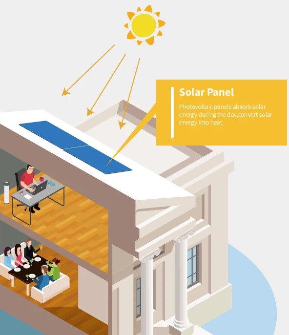Solar Panel:Photovoltaic panels absorb solar energy during the day,convert solar energy into heat.