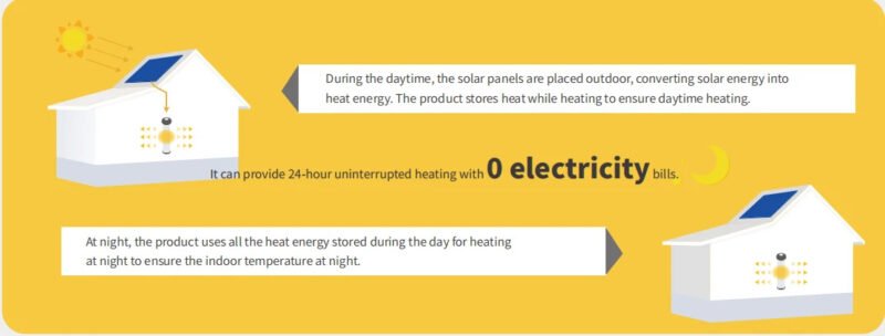During the daytime, the solar panel converts the solar energy into heat energy, and the heat energy is stored in the electric heater and starts to send heat to the outside to ensure the heating during the day; at night, the heat energy stored in the electric heater is sent to the outside to ensure the indoor temperature at night. 24-hour uninterrupted heating with 0 electricity bills. This product does not need to lay the line, easy installation, energy saving and environmental protection, no electricity, long service life.