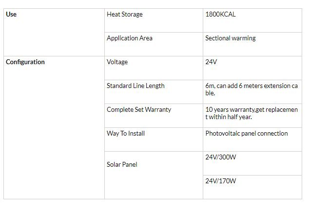 Energy saving and emission reduction, photovoltaic heat storage, green heating; no electricity bill, 24-hour free heating. Low voltage safety, continuous and stable heating, no risk of electric shock.