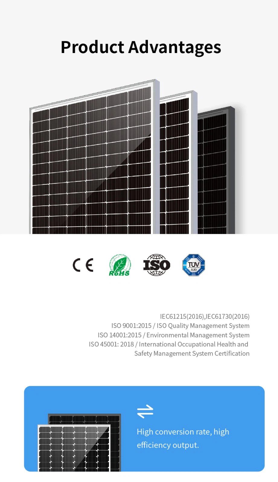 IEC61215(2016)1EC61730(2016)ISO 9001:2015/SO Quality Management SystemISO14001:2015/Environmental Management SystemISO45001:2018/International Occupational Health andSafety Management System Certification