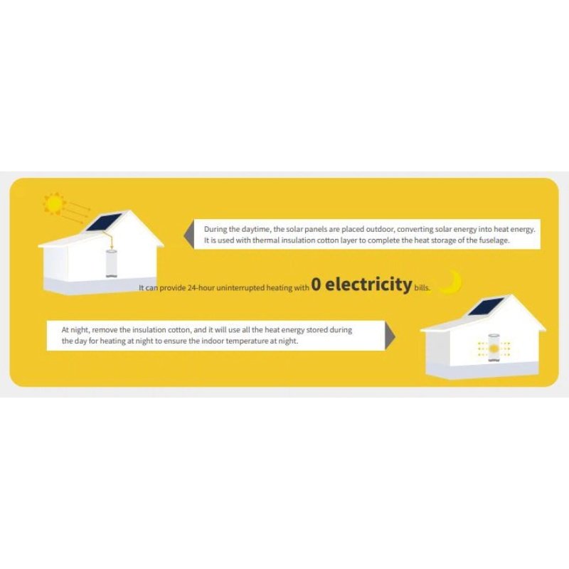 During the daytime, the solar panels convert the solar energy into heat energy, and the heat energy will be stored in the Warm Sunshine solar electric heater and begins to send heat to the outside, ensuring heating during the daytime and night; It can be used with insulation cotton layer during the daytime to store more heat faster; at night, the insulation cotton layer can be removed, the heating time will be longer, and the indoor temperature at night will be guaranteed. In areas where electricity is expensive, it can be charged in electricity valley, and used at electricity peaks. It is suitable for precisely generating heat and sectional heating in hotels, greenhouses, stores, breeding plants, workshops, warehouses, schools, office buildings, apartments, residential buildings, bungalows, villas and other commercial and civil places. This product does not need to lay the line, easy installation, energy saving and environmental protection, no electricity, long service life.