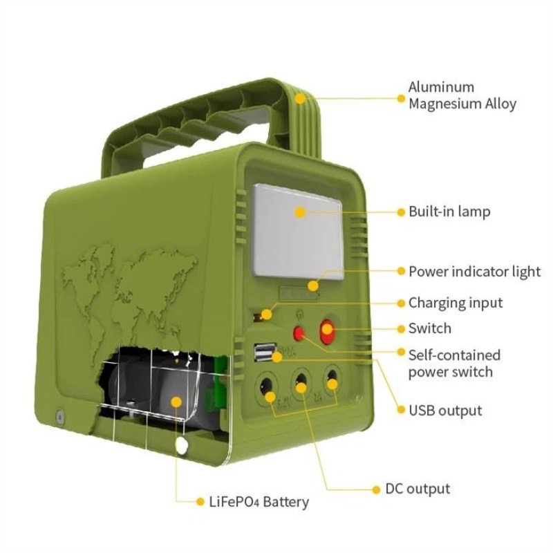 PV Energy Storage System-Smart Power(mobile charging+) Smart Power Battery Electric: LiFePO4 battery 42W·h ;Solar Panel: 5V/5W DC Output: Three circuit DC output 3.2V; USB Output: One circuit output 5V/2A ; Built-in Lamp: 2 Levels, higher power and lower power ; External Lamp: Common 6W LED× 3pcs; Warranty: Battery warranty 5