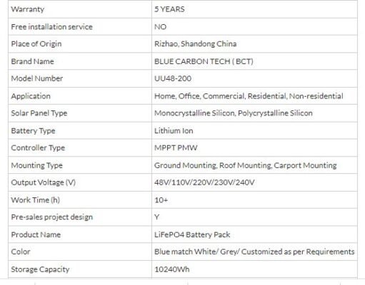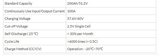 attery Parameter: Item: UU48-200 Rated Voltage/Capacity: 51.2V/200Ah Continuous Input Current: 80A Continuous Output Current: 80A Charging Voltage: 57.6V -60V Cut-off Voltage: 2.5V single cell Cycle Life: >6000 times <0.8C Warranty: 5 Years BMS: BMS(Battery Management System) is any...