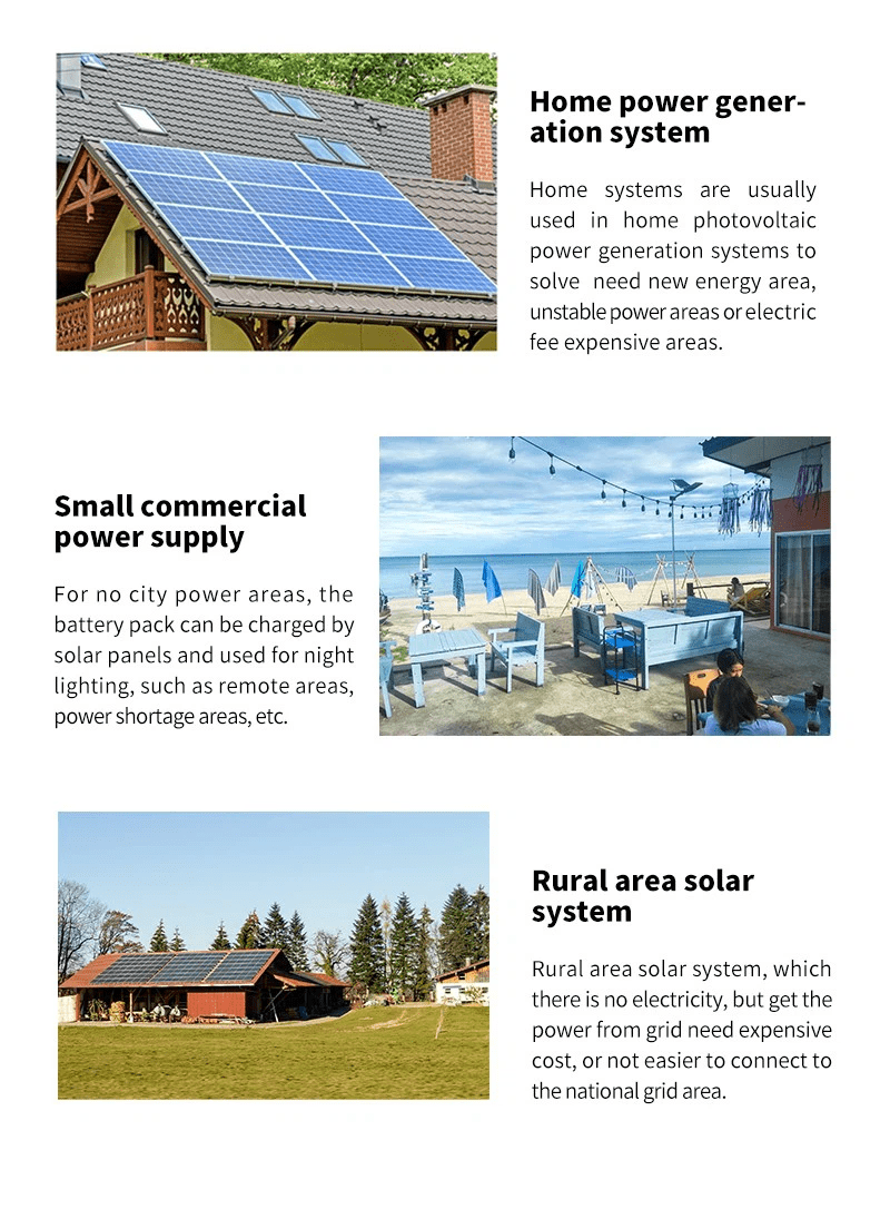 For no-city power areas, the battery pack can be charged by solar panels and used for night lighting; For the areas where city power is expensive, the battery pack can be charged during the electricity valley value period, and used at the peak power period; For the areas which power off from time to time, the battery pack can be used as UPS, to avoid information loss caused by a sudden power outage.