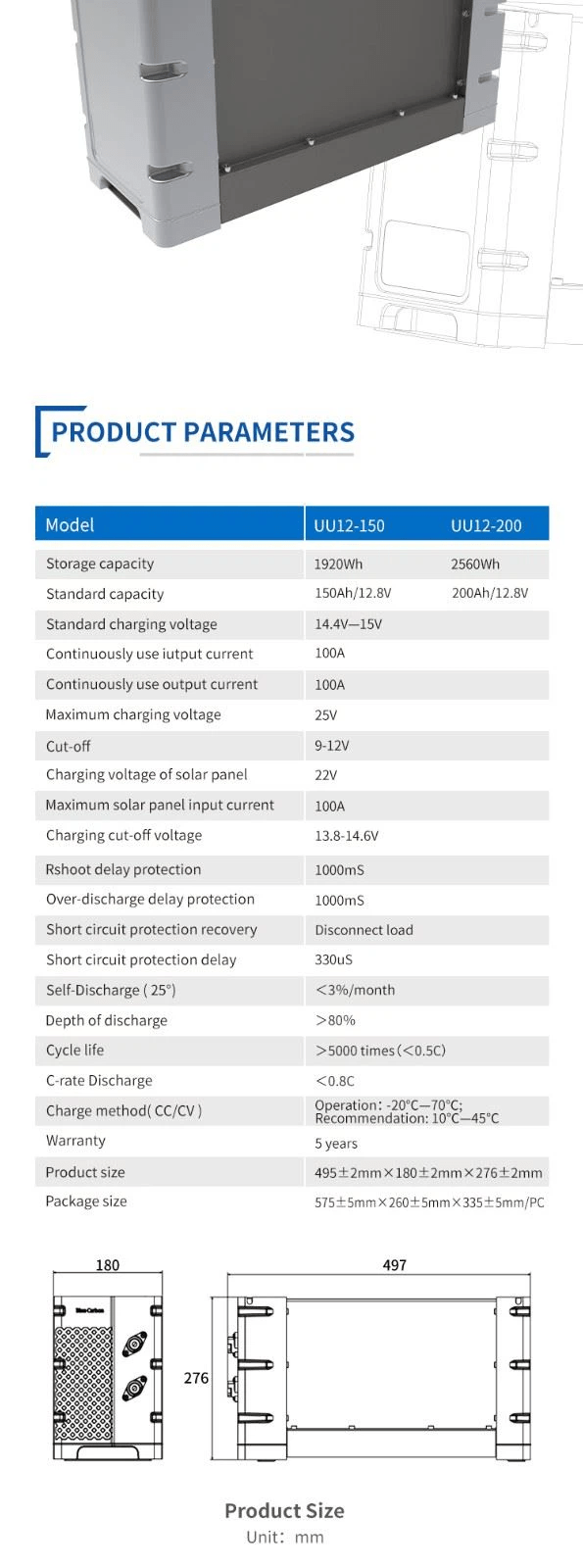 The 12v200AH Lithium ion battery built in BMS 1.High quality aluminium magnesium alloy, anti-corrosion, substantial, durable, artistic, practical. 2.All in one mould design and production, easy to install. 3.With longer span life LiFePO4 battery, over 12 years lifespan, ensure the whole set products’life span. 4.Dustproof structure d esign, DC output, safe and reliable. 5.Integrated packaging, safe and convenient to transport.
